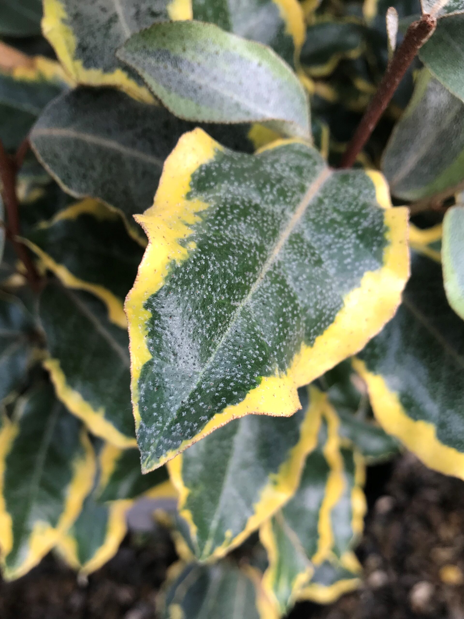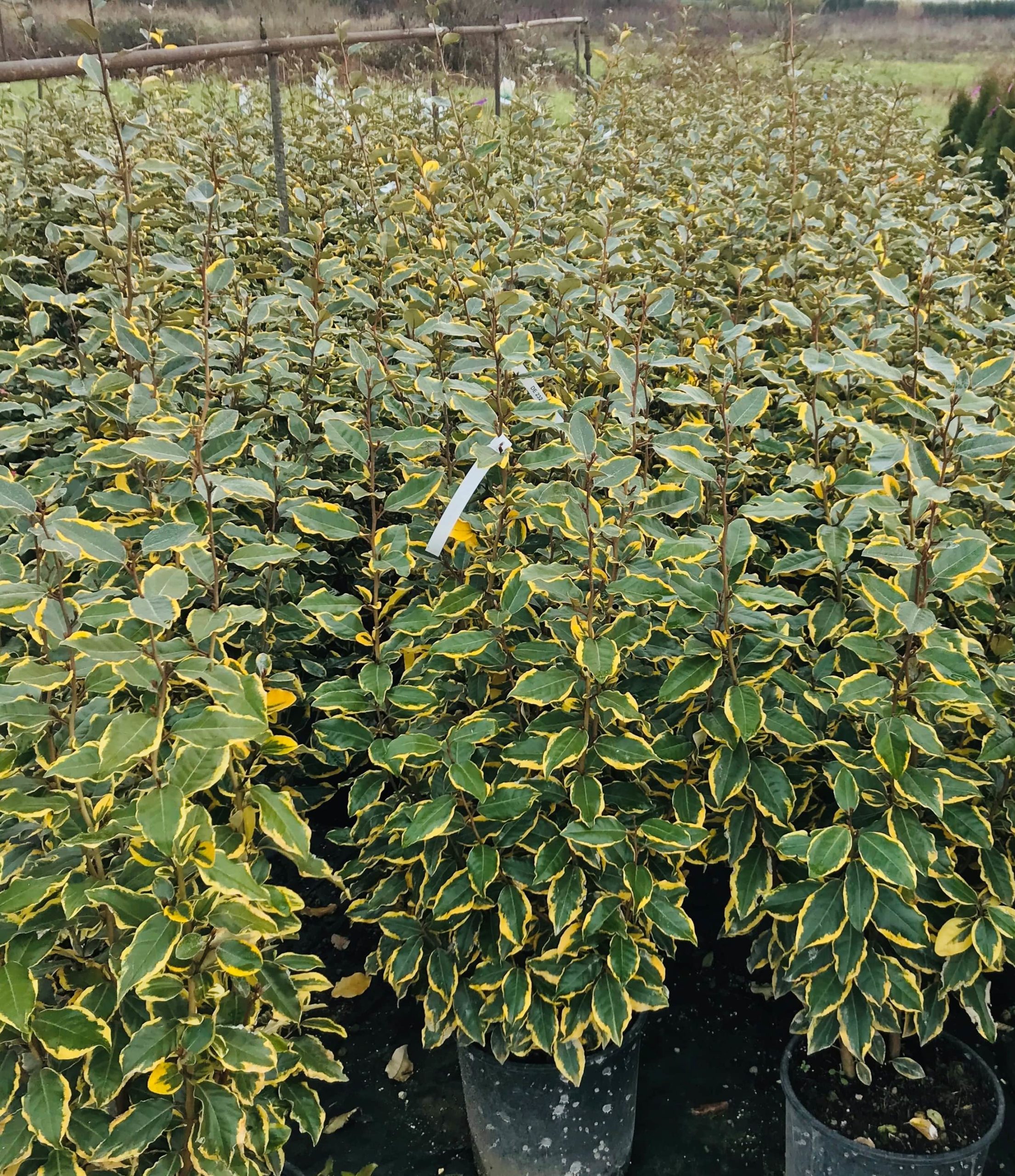 This relatively new variety of Elaeagnus makes a beautiful evergreen hedge in a short time with its upright semi-compact habit. Its central green leave with yellow / golden margin brightens up a dark area.
