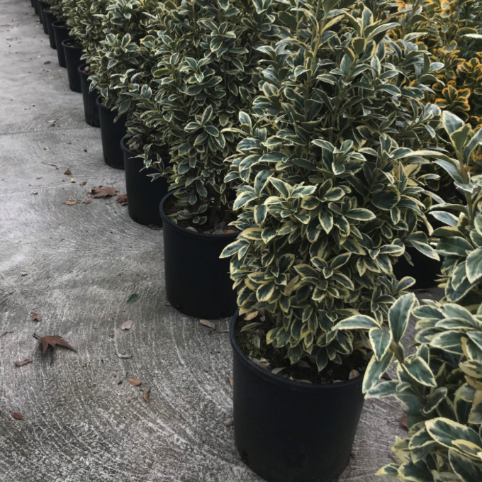 Leaves are dark green in the centre, with broad creamy-white margins. Evergreen by nature the bush form is also popular for low hedges up to 100cm high as it enjoys pruning.
