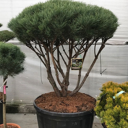 This variety of dwarf scotch pine also known as Pinus sylvestris Nana will maintain a roundish habit on its stem with very compact growth. The needles are a grey green colour with silvery tones.