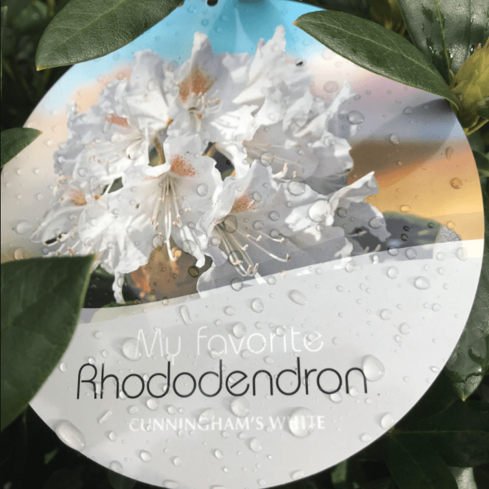 Rhododendron Cunninghams White is my favourite white variety of Rhododendron. Reliably, it puts on a fantastic show of flowers every year as the mauve buds open up into a full funnel shaped white flower with a hint of yellow in the centre.